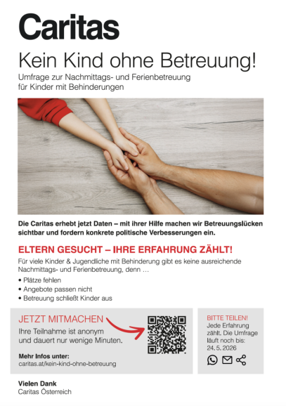 Die Caritas Österreich führt aktuell eine österreichweite, wissenschaftlich begleitete Befragung von Eltern zur Nachmittags- und Ferienbetreuung von Kindern mit Behinderungen durch, da für viele Kinder und Jugendliche mit Behinderungen keine ausreichenden Betreuungsangebote zur Verfügung stehen.